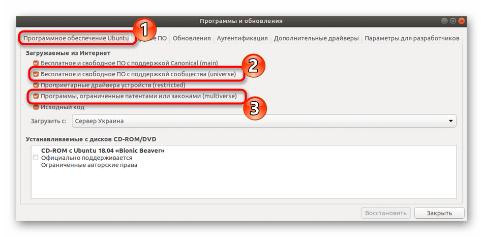 Во вкладке «Программное обеспечение» отметьте галочками пункты «Бесплатное и свободное ПО с поддержкой сообщества (universe)» и «Программы, ограниченные патентами или законами (multiverse)». После этого примите изменения и закройте окно настройки.