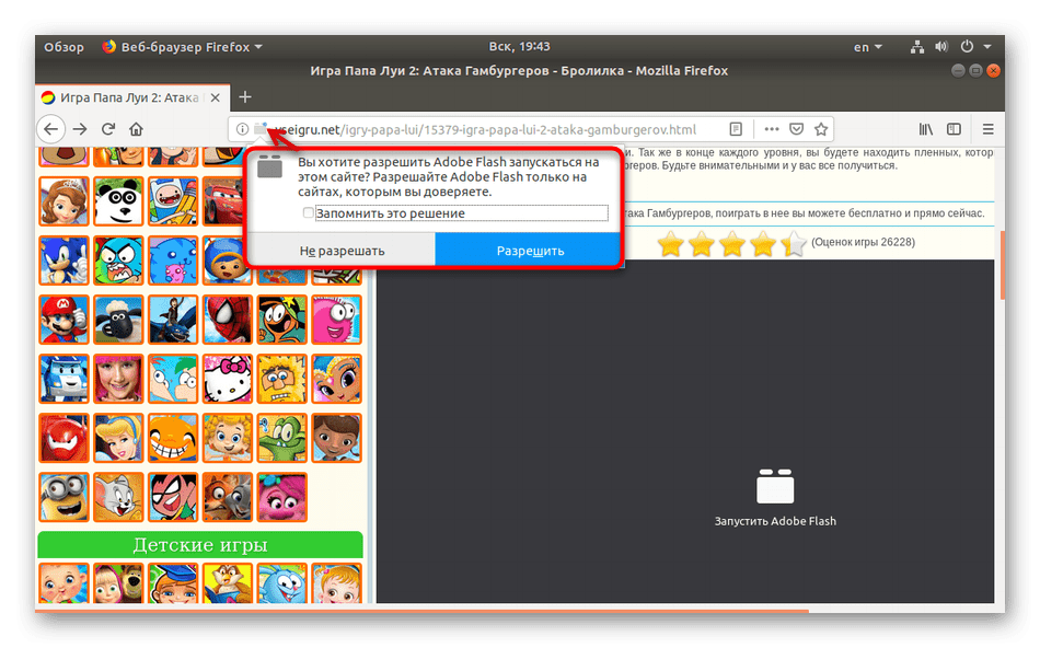 Кроме этого, не стоит забывать, что при запуске приложений и видео в браузере может появиться уведомление о разрешении на запуск Adobe Flash Player. Примите его, чтобы запустить функционирование рассматриваемого компонента.