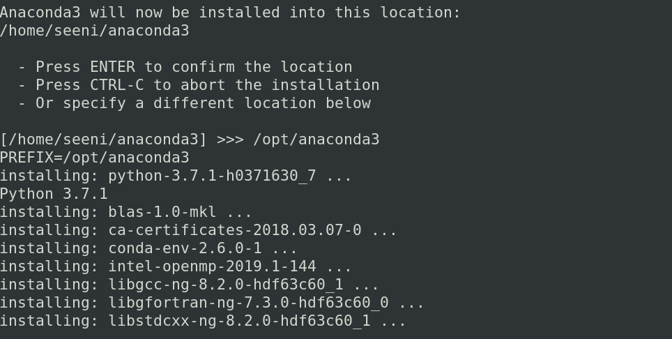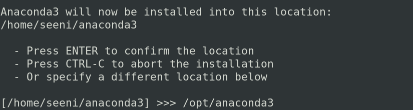 Когда в командной строке наберется «да», установщик Anaconda спросит, куда вы хотите установить приложение. По умолчанию он выберет домашний каталог. Оставьте значение по умолчанию и нажмите клавишу Enter, чтобы продолжить.