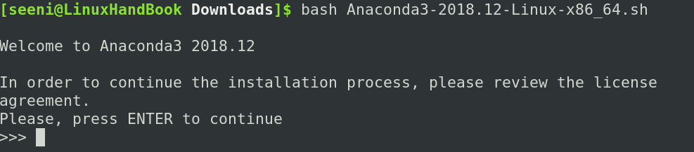 Установка Anaconda в Ubuntu может начаться после загрузки сценария установки и задания разрешений. Чтобы начать установку, выполните приведенную ниже команду ./Anaconda3-2020.11-Linux-x86_64.sh.