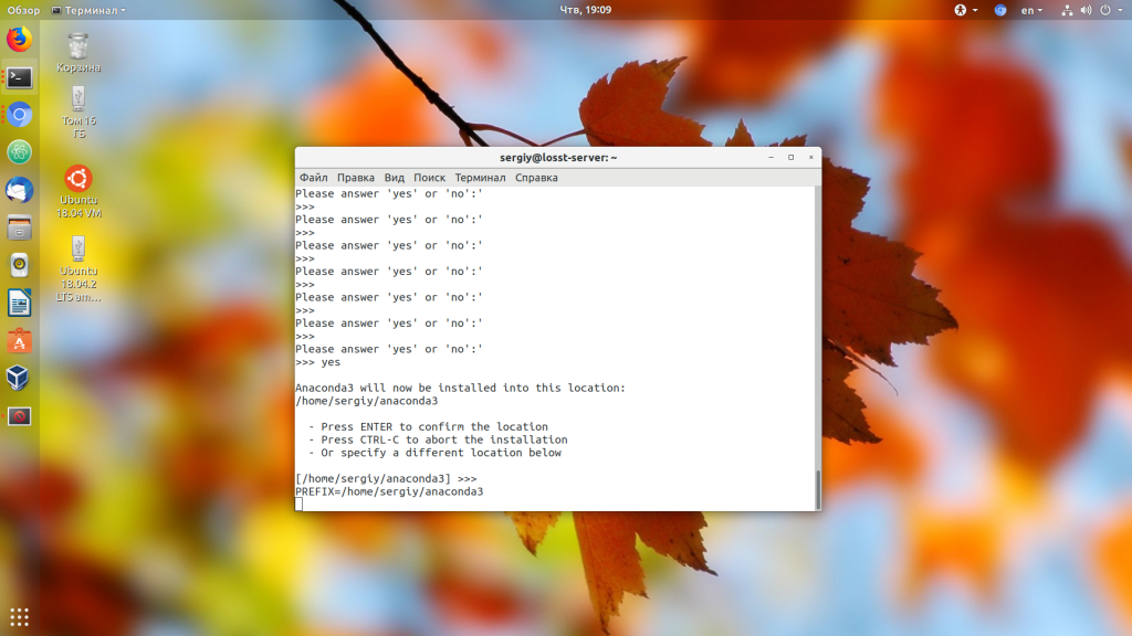 Затем пойдёт установка Anaconda 3 Ubuntu. Процесс установки займёт некоторое время.