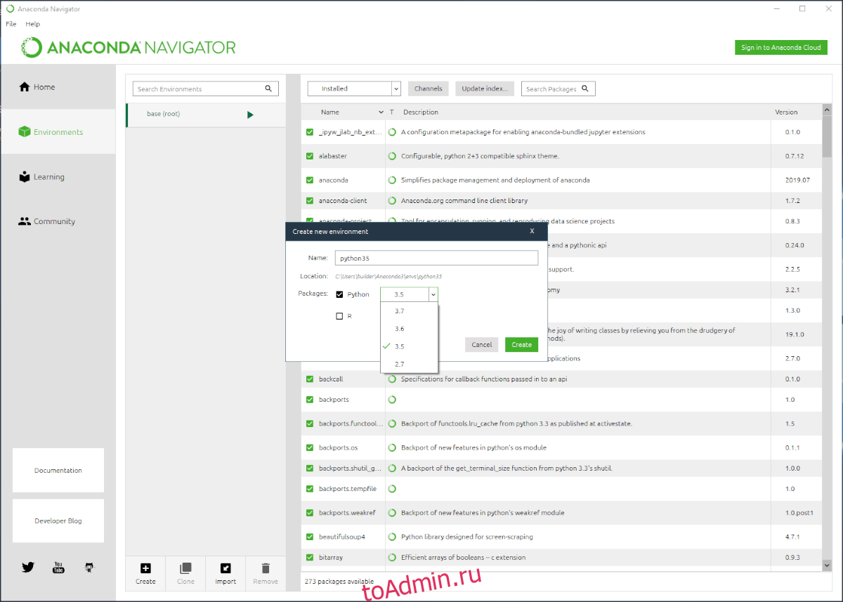 Также вы можете создать новое окружение с другой версией Python. Например, сделаем окружение с Python 3.5: