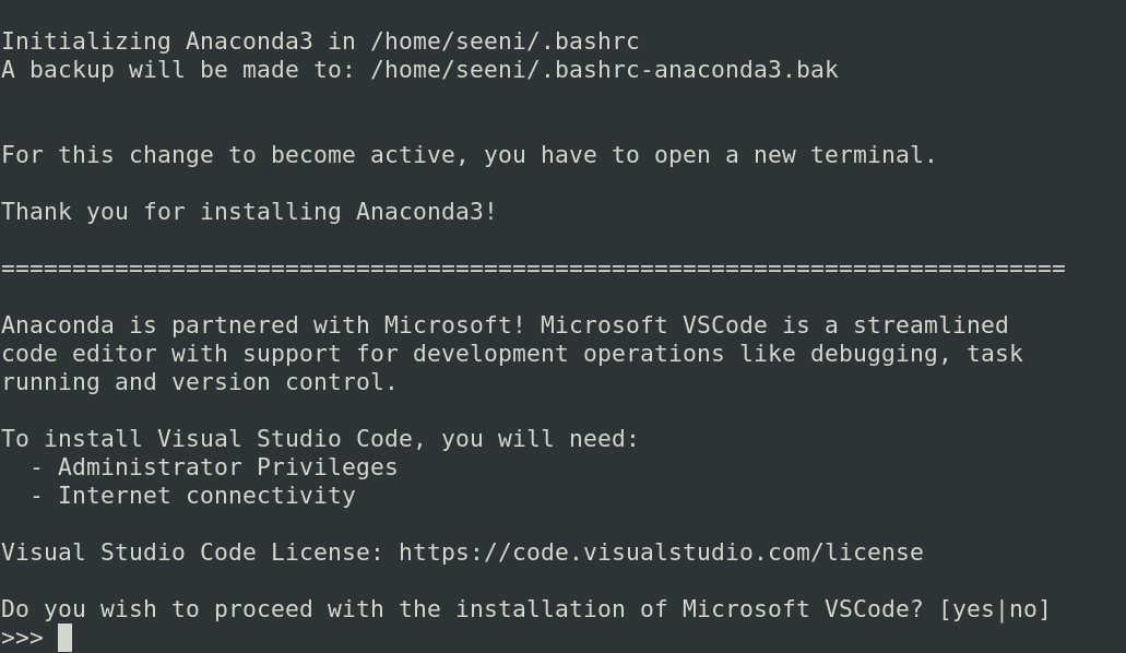 Когда установка будет завершена, установщик Anaconda спросит: «Вы хотите, чтобы установщик инициализировал Anaconda3, запустив conda init? «. Если вы хотите включить Anaconda 3, введите «да». В противном случае закройте терминал.