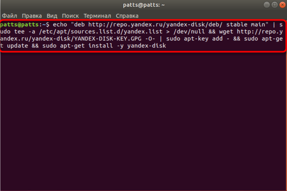 - В терминале добавить репозиторий (хранилище программ) командой: echo «deb http://repo.yandex.ru/yandex-disk/deb/ stable main» >> /etc/apt/sources.list.d/yandex-disk.list