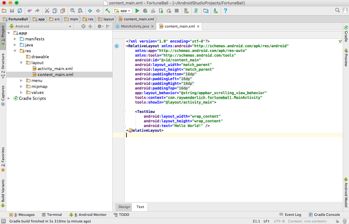 В этом файле макета содержится ссылка на content_main.xml, который вы прежде редактировали. Он по умолчанию определяет контент (тулбар и плавающая кнопка действия). Однако в данном конкретном приложении (Fortune Ball) плавающая кнопка не нужна. Поэтому уберите следующий блок кода из xml-файла: