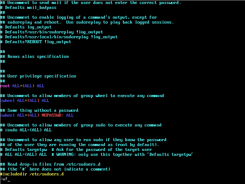 Откроется редактор Vi с файлом настроек sudo.