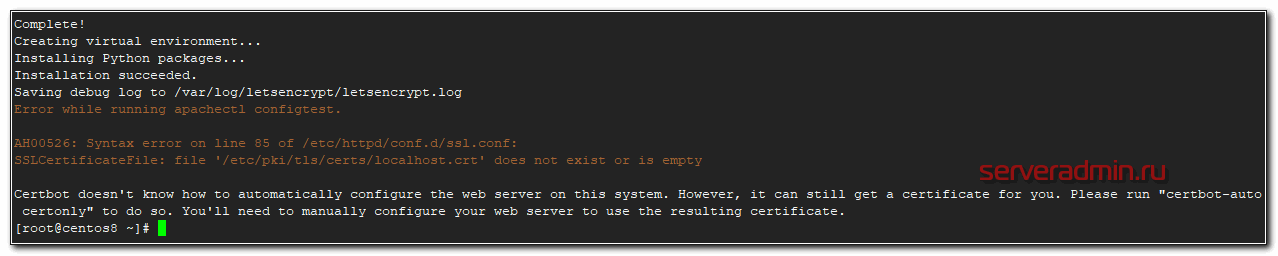После установки пакетов certbot, если его запустить, напишет ошибку, что не может сам настроить apache.