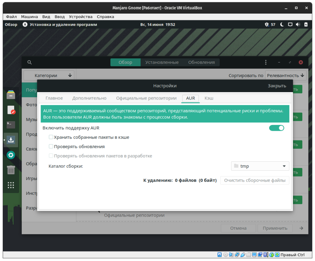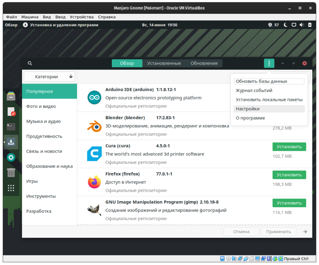 Чем мне нравятся системы основанные на Arch, так это тем, что у них есть кладовая под названием AUR. В которой найдется все, что что только существует в Linux. И так, для установки Ungoogled-Chromium мы и воспользуемся AUR. Для этого он у вас разумеется должен быть подключен. Пример установки Ungoogled-Chromium буду показывать на Manjaro. Что бы подключить AUR, открываем приложение под названием “Установка и удаление программ”. Затем переходим в настройки:
