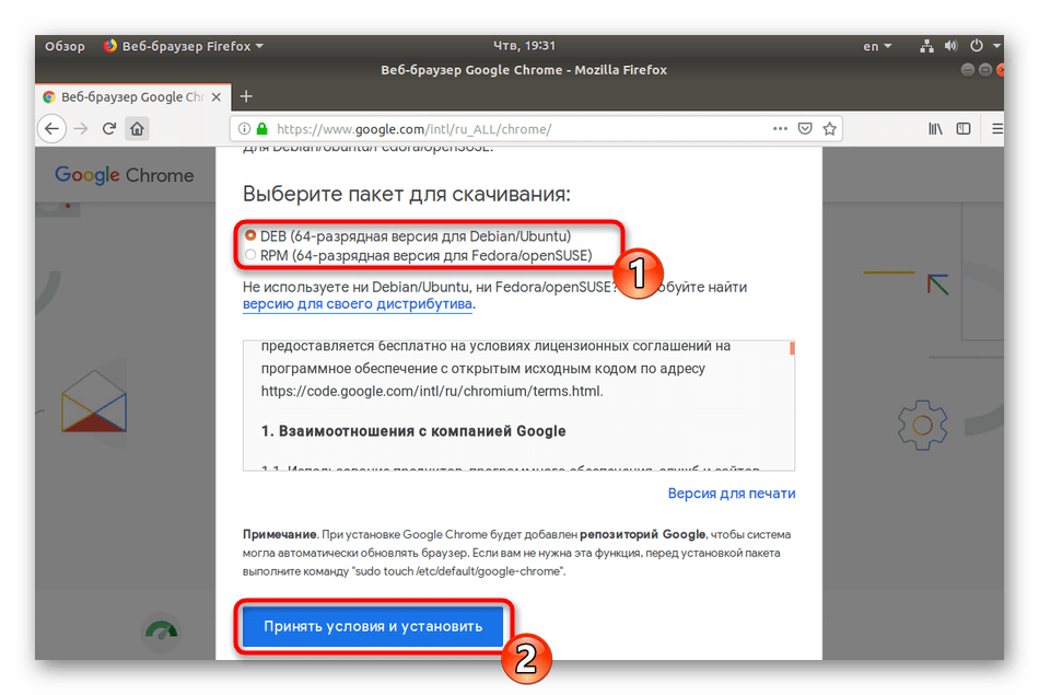 Выбрав 64-разрядный вариант .DEB, нажмите или нажмите Принять и установить , чтобы продолжить.