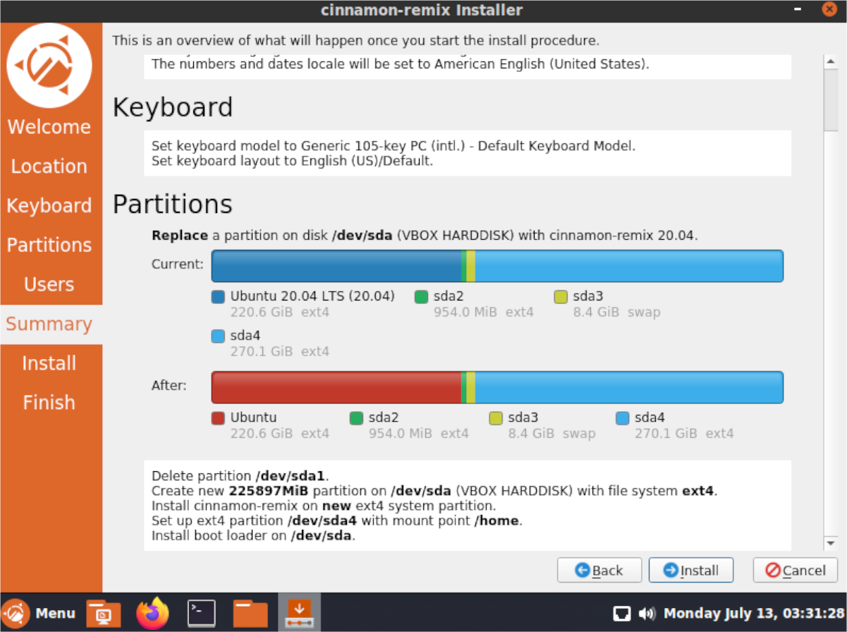 Шаг 9: После экрана создания пользователя установщик покажет обзор того, как будет происходить установка. Взгляните на обзор и убедитесь, что вы хотите установить ОС именно так. Если нет, нажмите «Назад» и измените его.