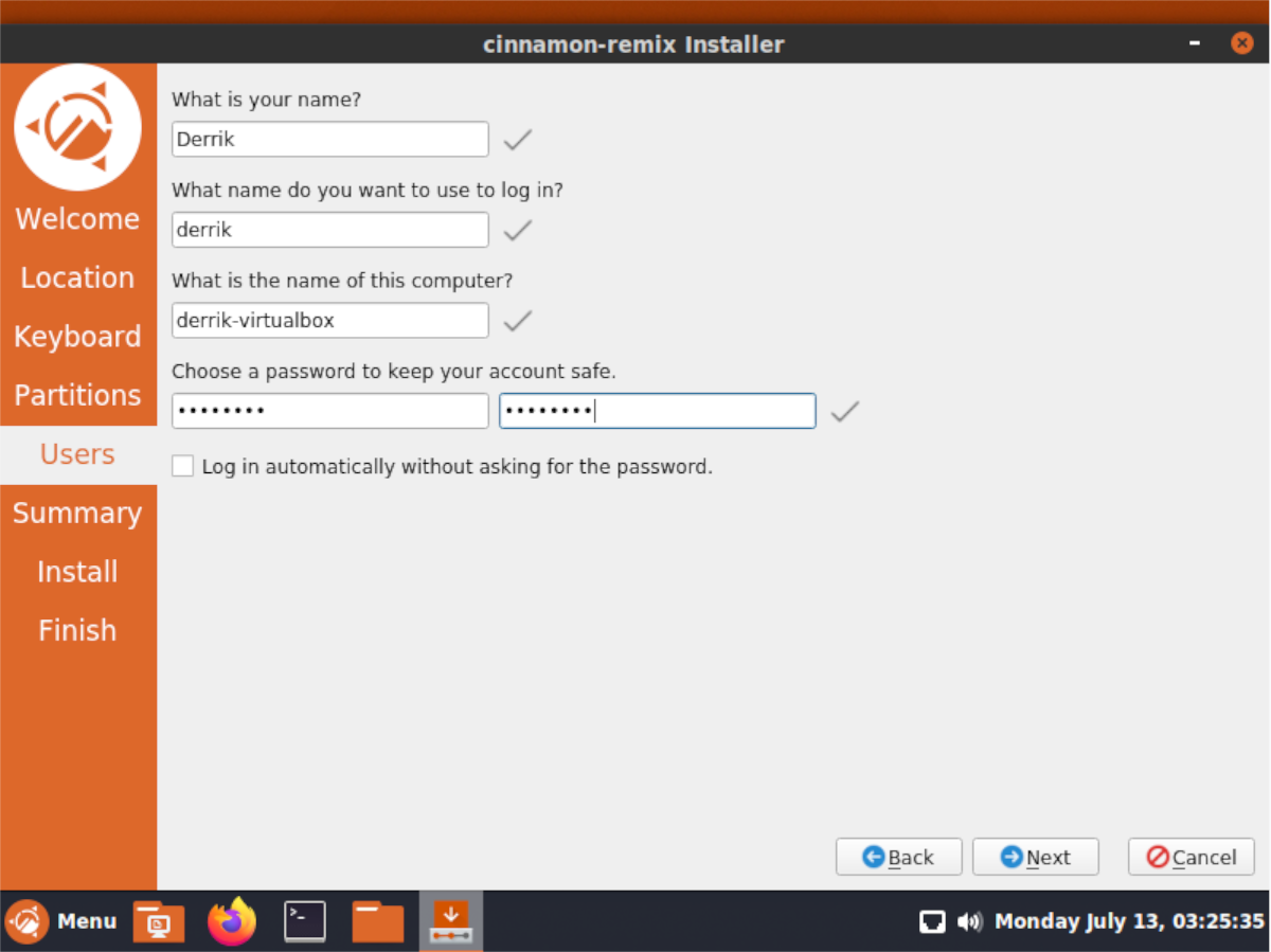 Шаг 8: Когда вы настроили разделы для новой установки, вы должны создать учетную запись пользователя. С помощью экранного средства создания пользователей настройте новую учетную запись пользователя Ubuntu Cinnamon Remix. Затем нажмите кнопку «Далее», чтобы продолжить.