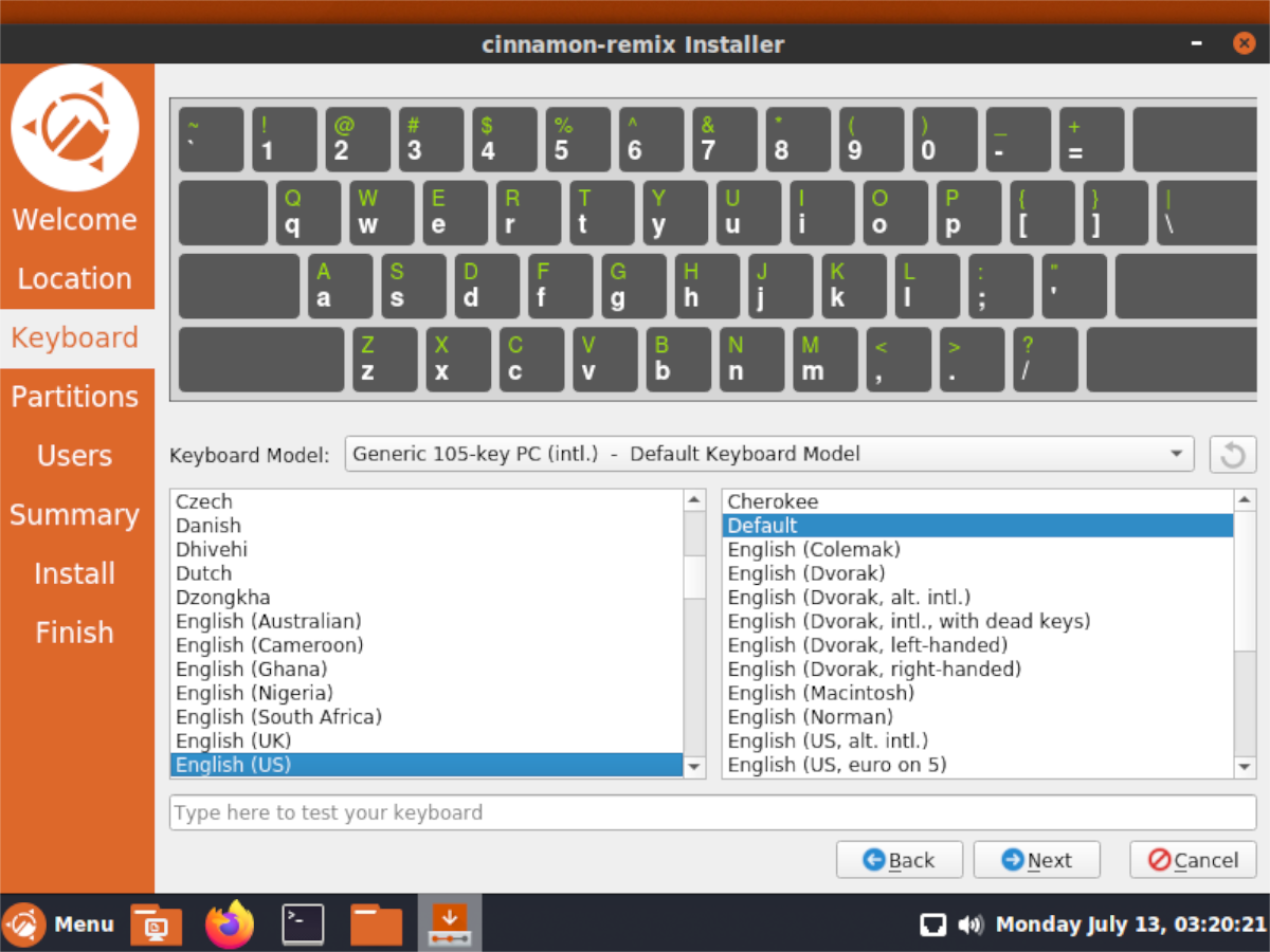 Шаг 6: За страницей часового пояса вам будет предложено установить раскладку клавиатуры. Просмотрите список вариантов и установите нужный макет. Затем нажмите «Далее», чтобы перейти на следующую страницу установщика.