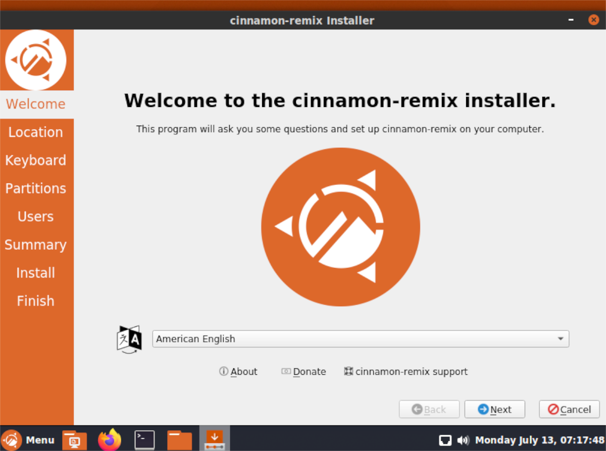 Шаг 4: Когда установщик откроется, вы увидите сообщение «Добро пожаловать в программу установки cinnamon-remix». Нажмите кнопку «Далее», чтобы начать.