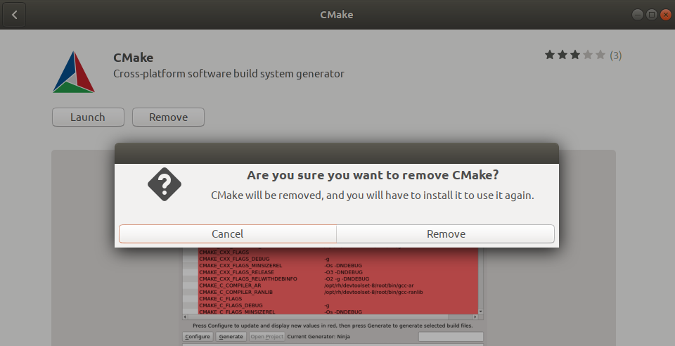 Open the Ubuntu Software Manager and search for CMake. You will see the “Installed” status in the search entry. Click this entry and then click Remove from the following view: