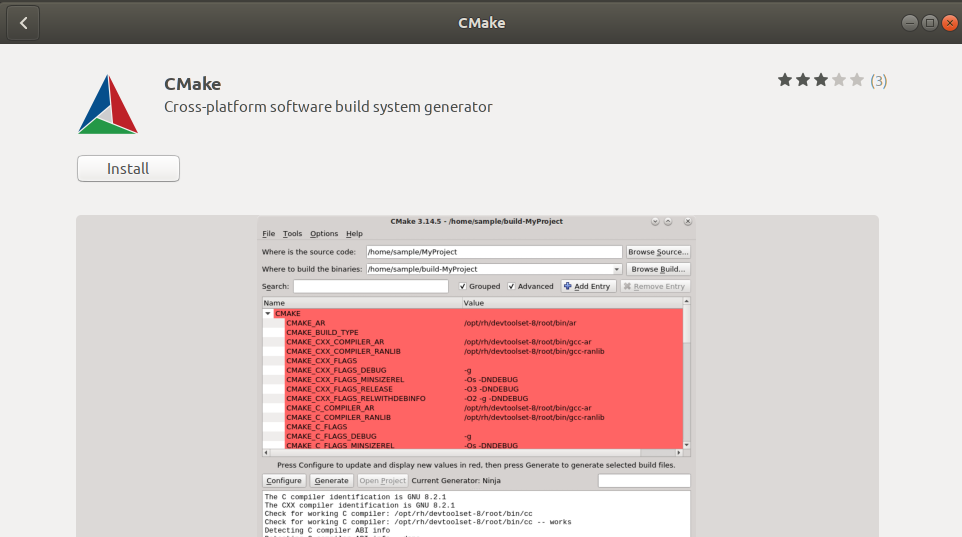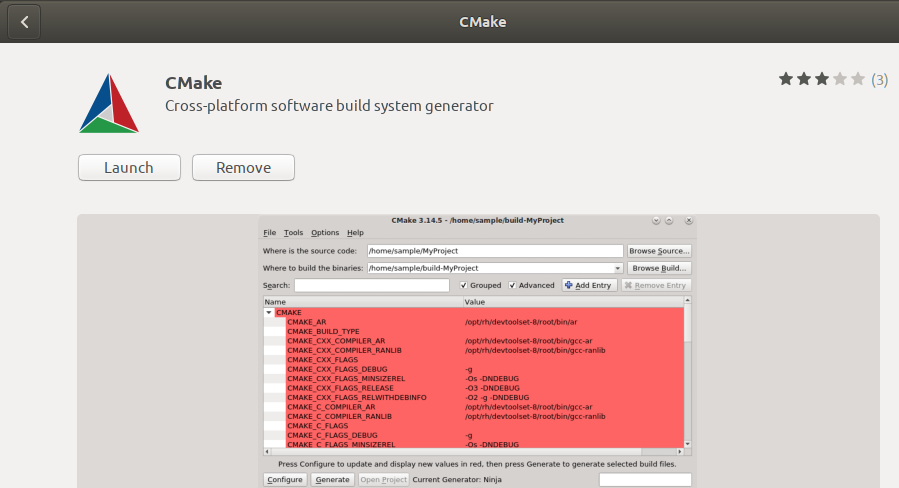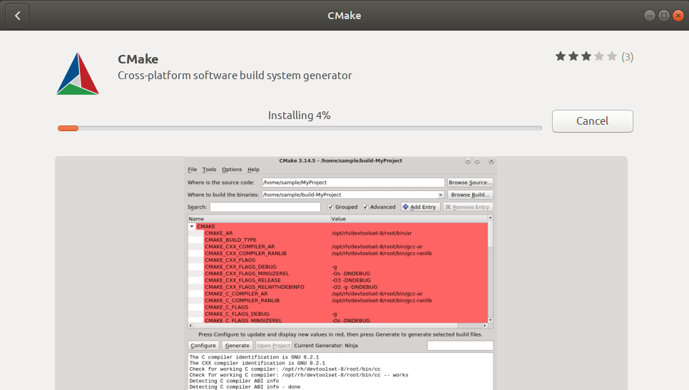 The latest version of CMake at the time of writing this article was 3.20.0 and luckily available through the Snap Store. Here, we will explain how you can install it through the Ubuntu Software Manager.