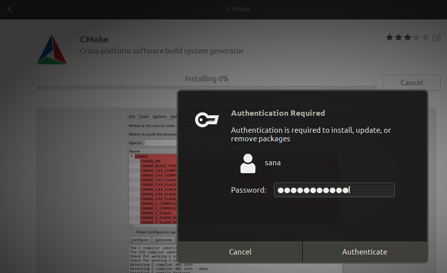 Нажмите кнопку Установить, чтобы запустить процесс установки CMake. Возможно, вам придётся ввести свой пароль в окошке аутентификации, которе появится сразу после нажатия кнопки Установить. Это одна из форм защиты в Ubuntu — только авторизированный пользователь может устанавливать программное обеспечение в этой системе.