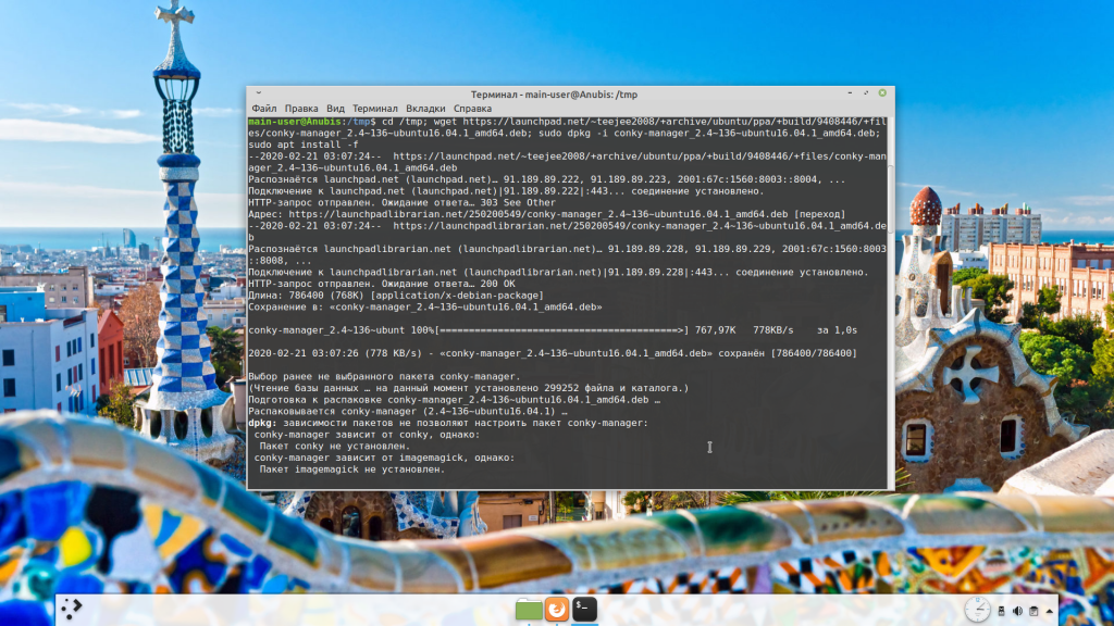 Разработка Conky Manager давно уже прекращена, так что установить эту программу из репозитория могут только обладатели Linux Mint 17.3 и более ранних версий. Для этого нужно выполнить в терминале три команды: