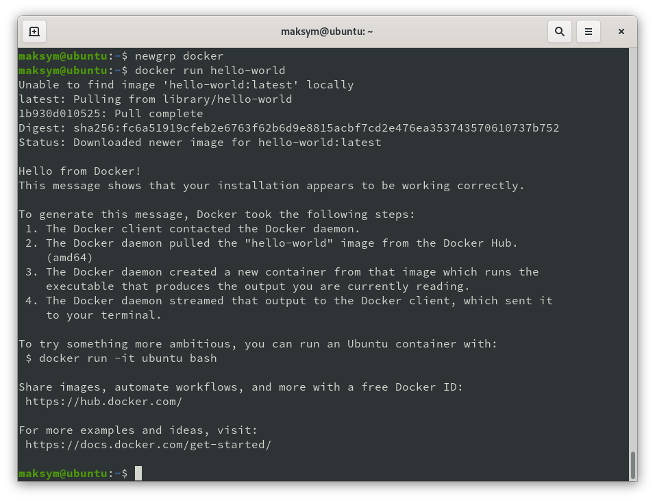 Если в терминале появились сообщения, указанные на скриншоте, расположенном выше, то вы успешно установили Docker на DEB-дистрибутив Linux!