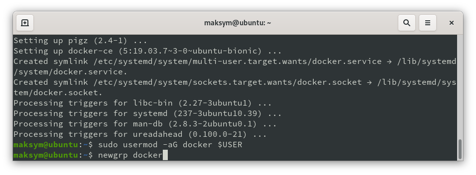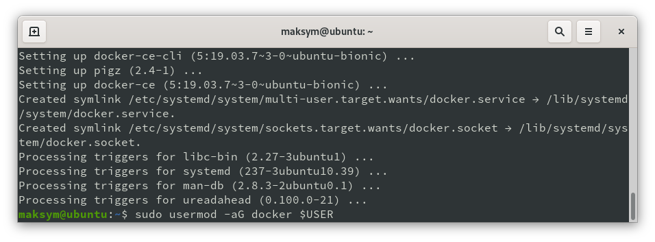 После скачивания и установки Docker нам нужно добавить пользователя в группу Docker, чтобы иметь возможность использовать команды Docker без прав суперпользователя:
