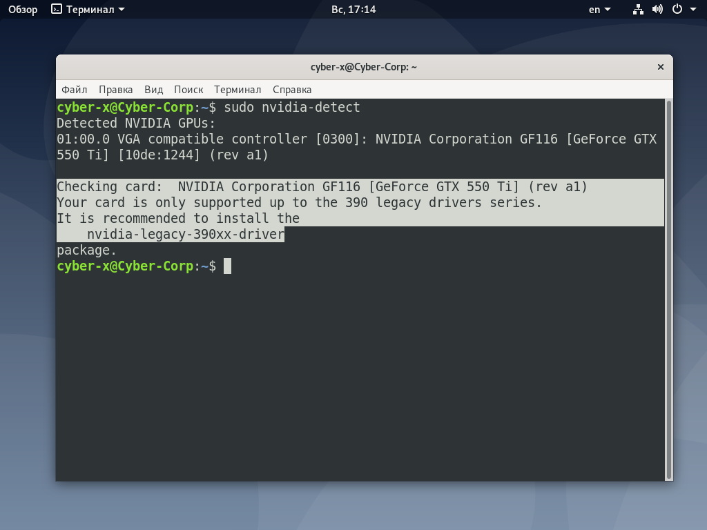 Утилита nvidia-detect позволяет посмотреть информацию о видеокарте компании Nvidia и определить рекомендуемую версию драйвера для этой модели. Устанавливается утилита с помощью следующей команды: