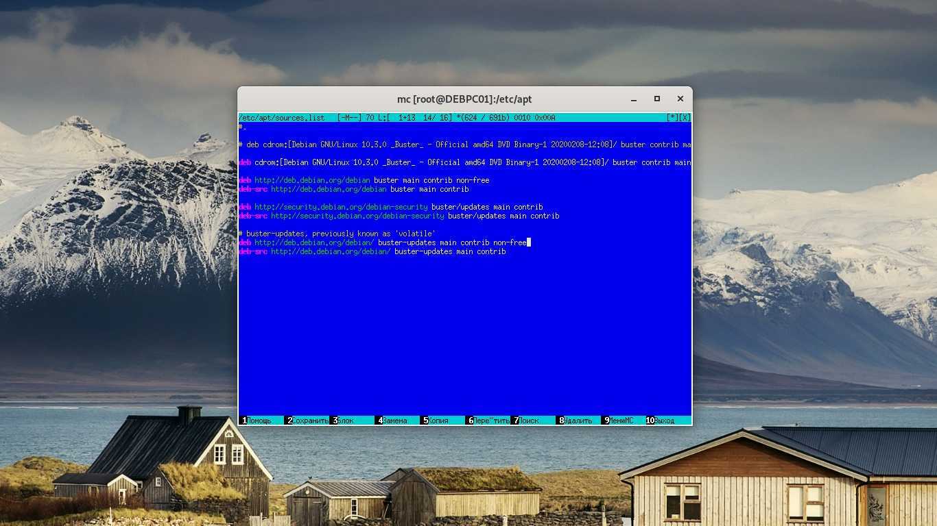 Открываем файл с репозиториями sources.list в mcedit и добавляем туда ветки contrib и non-free:
