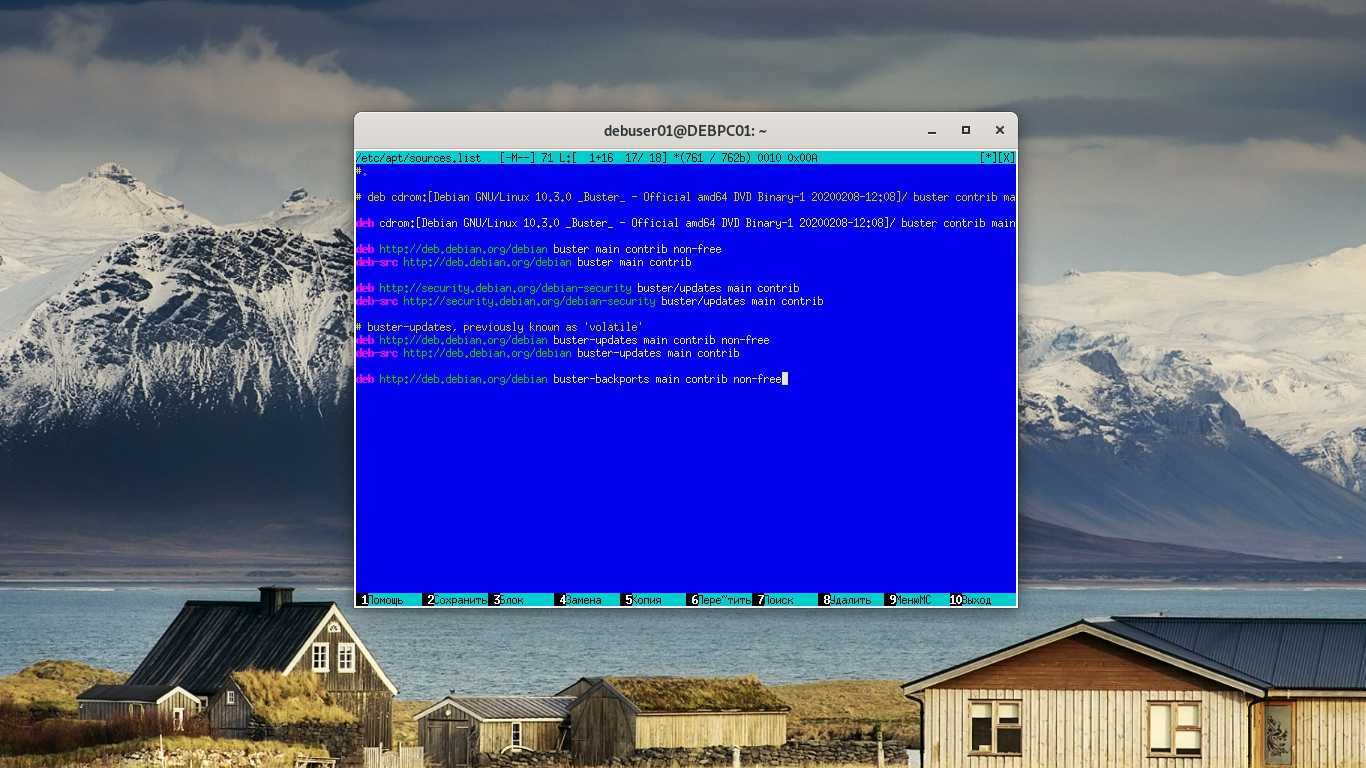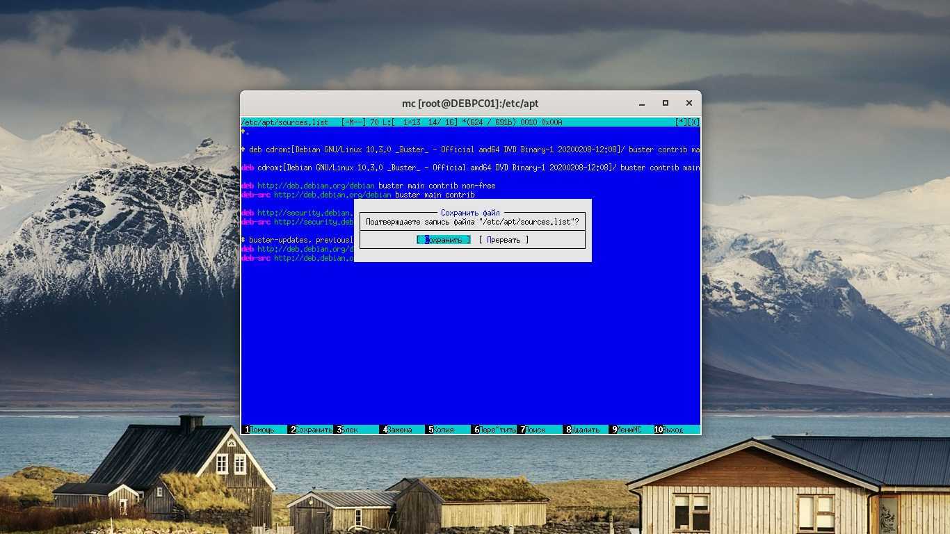 Сохраняем изменения в sources.list с помощью нажатия клавиши F2. Выходим из текстового редактора, нажав клавишу F10.