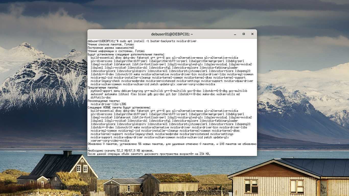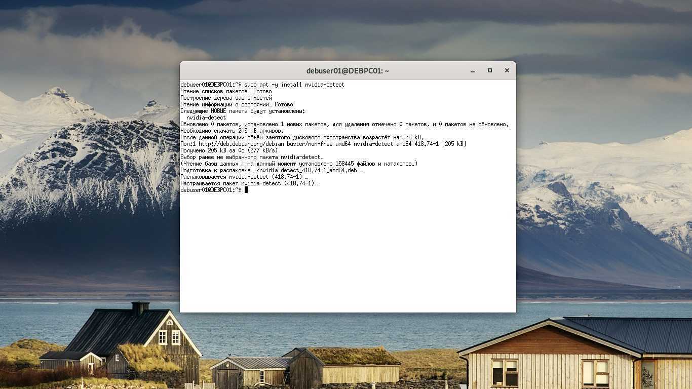 Теперь можно приступать к установке драйвера для видеокарты Nvidia. Сначала давайте установим утилиту “nvidia-detect”. Данная утилита определит видеокарту и покажет рекомендованный видео драйвер. Все в том же терминале выполняем следующие команды: