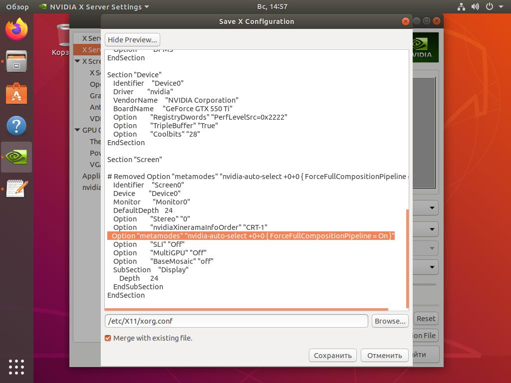 В том случае, если у вас появился тирринг при работе с видео картой от Nvidia, давайте его устраним. Идем в Nvidia-Settings, затем выбираем пункт “X Server Display Configuration” и жмем кнопку “Save to X Configuration File”: