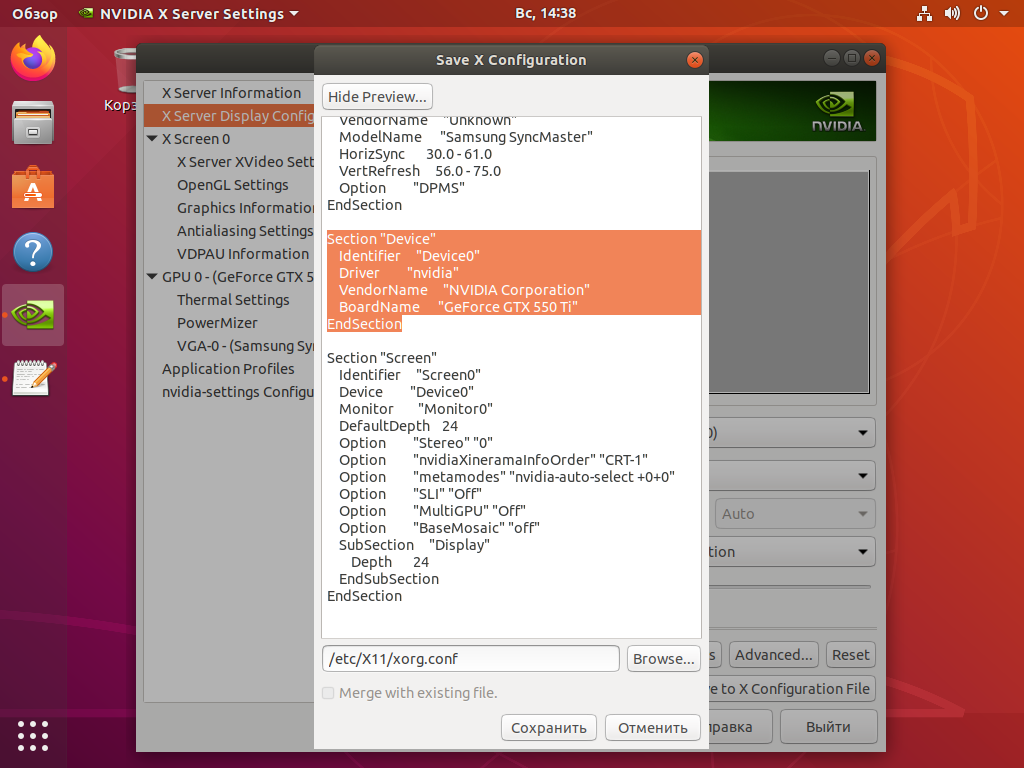Запускаем пакет nvidia-xconfig для автоматического создания конфигурационного файла: