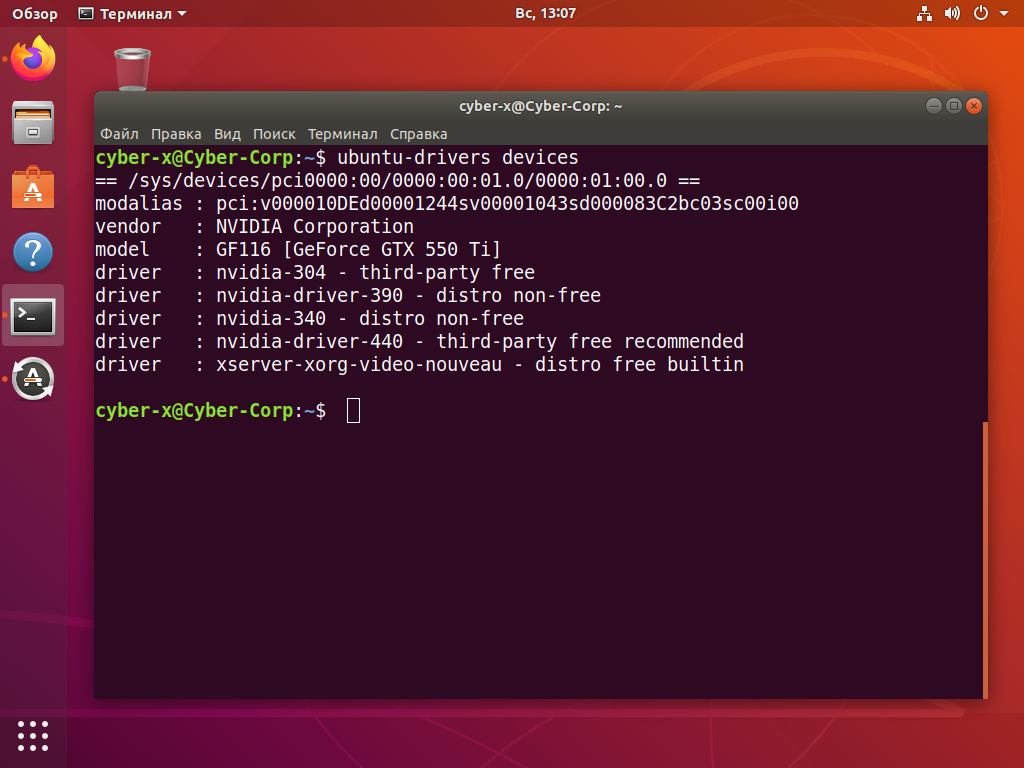 Теперь давайте запустим утилиту “ubuntu-drivers”, это консольная утилита покажет нам какие драйвера можно поставить. Для ее запуска выполняем команду в терминале: