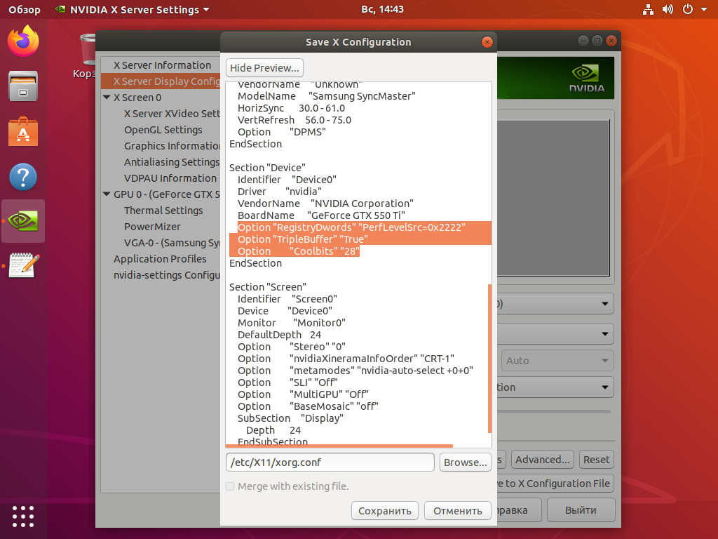 Для активации возможности разгона формируем и редактируем xorg.conf: