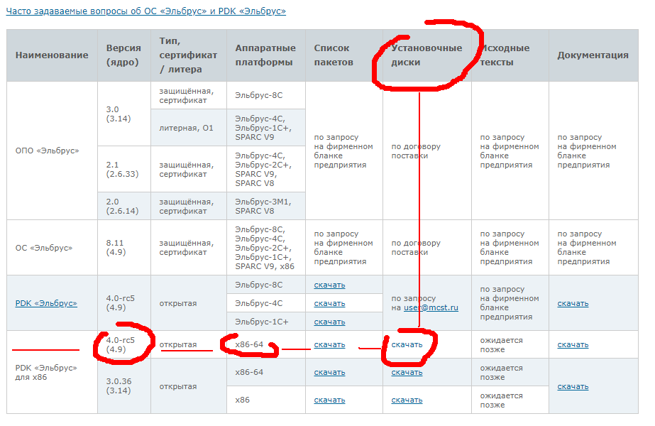 Дело в том, что под этим именем часто выступают, как классическая 32-битная платформа, так и её 64-битная версия. По большому счёту это, действительно, одна процессорная архитектура. Чистый «x64» (IA-64) не пользовался популярностью и был закрыт. Да упокоит святой Коннектий душу проекта «Itanium». Так вот, не обольщайтесь надписью «x86». 32-битный «Эльбрус» для привычной нам архитектуры, да на ядре «Linux 4.0 (4.9)» ещё недоступен. Обещают выкатить в июне, посмотрим, когда у них наступит июнь. Можно скачать с ядром 3.0 (3.14), а можно не скачать. Я выбрал для эксперимента ту ось, что далее отмечена зелёным. Всё, что вообще можно попробовать на вашем домашнем ПК, обведено синим: