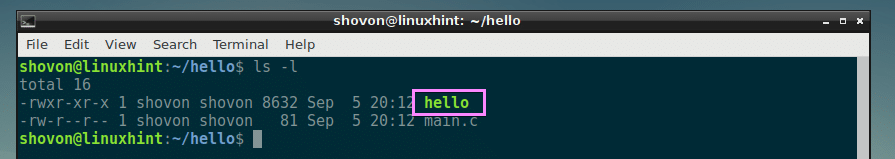 When the compiling process is done, there should be a file called hello in the current directory. We can check this if we list the files and directories with this command: