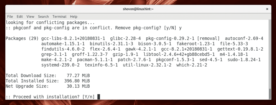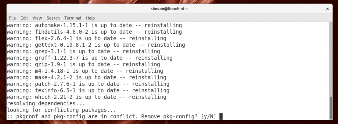 You may see something like this. It’s nothing serious as far as I know. It’s just a package was renamed from pkg-config to pkgconf. So Pacman is asking you whether you want to use the new package and remove the old one. Just press y and then press <Enter>.