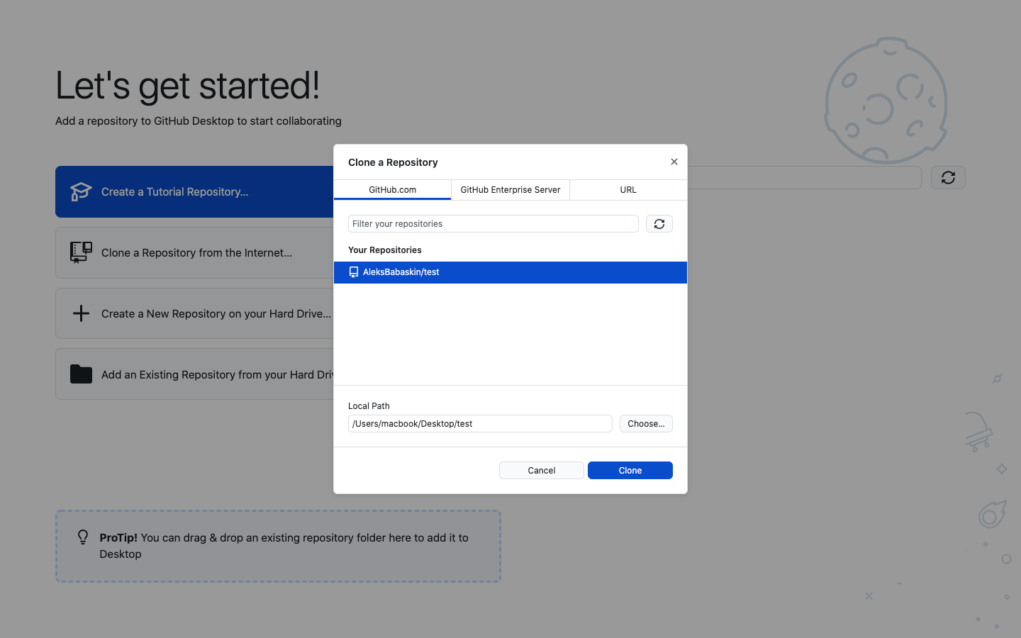 Теперь, когда вы установили Git, если вы захотите обновиться до более поздней версии, вы можете клонировать репозиторий, а потом выполнить сборку и установку. Чтобы найти URL-адрес для использования при клонировании, перейдите к нужной ветке или тегу на странице проекта в GitHub и скопируйте клонируемый URL-адрес с правой стороны: