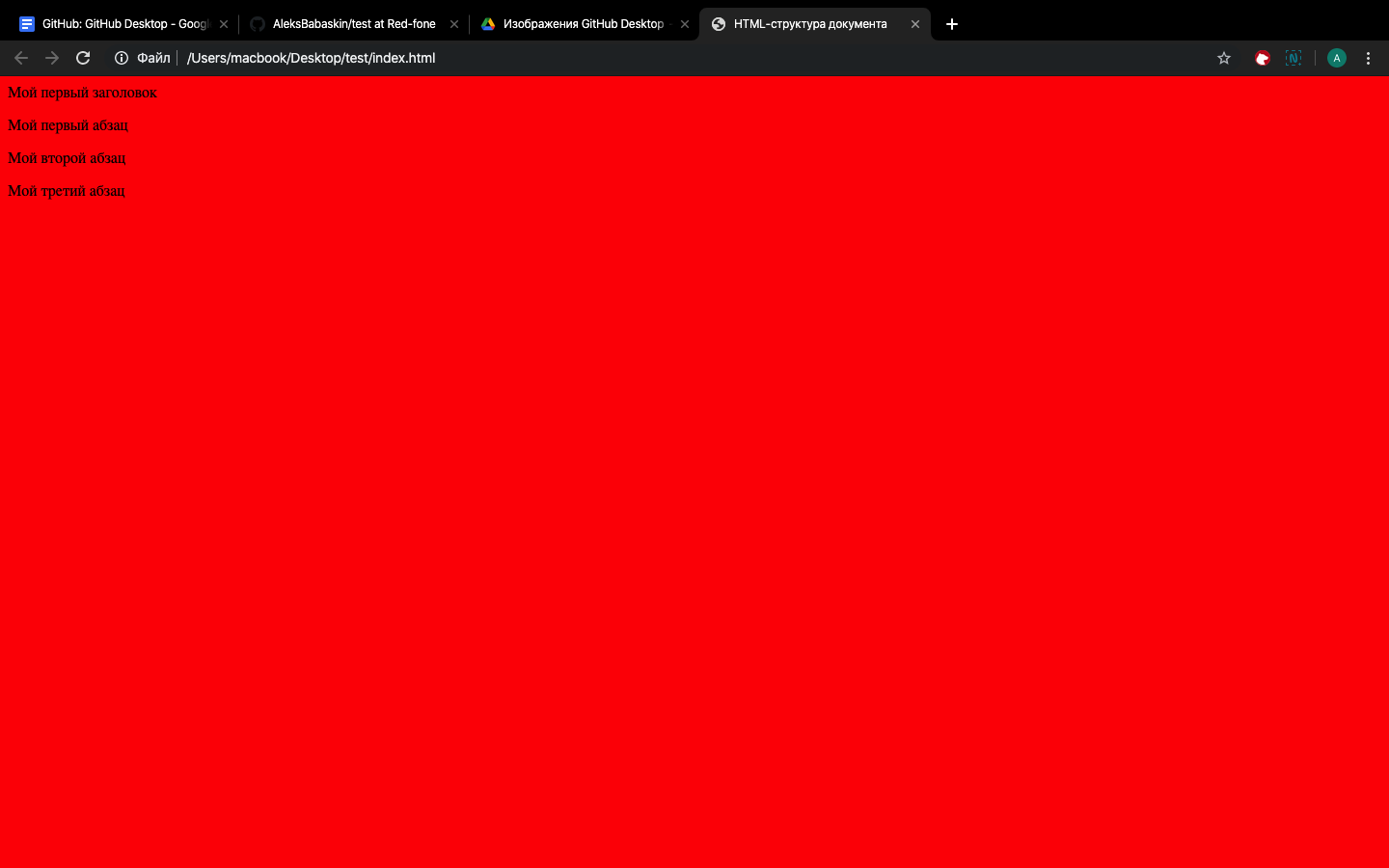 Если мы откроем созданную страницу в браузере, то это будет несколько строчек текста на белом фоне. Представим такую ситуацию: нам нельзя изменять код проекта, но нужно посмотреть, как будет выглядеть страница на красном фоне. Чтобы сделать это — добавим в репозиторий новую ветку:
