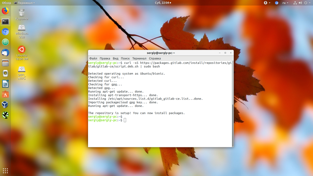 Затем нужно загрузить установщик репозитори из официального сайта. Этот скрипт загрузит и установит все ключи и инструменты необходимые, чтобы подключить репозиторий Gitlab в систему. Для его загрузки и запуска выполните команду: