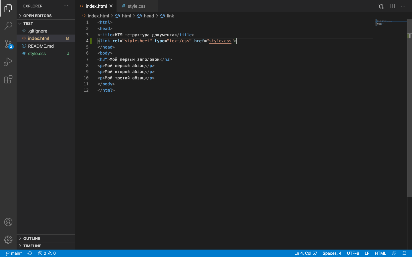 Добавим к проекту пустой CSS-файл и подключим его к HTML. После этого в меню редактора появятся два цвета: HTML-файл подсветится оранжевым, а CSS-файл — зелёным. Оранжевый означает, что файл уже есть в удалённом репозитории и его нужно обновить. Зелёный — файла нет в репозитории. Переходим в GitHub Desktop и добавляем коммит для этого изменения.
