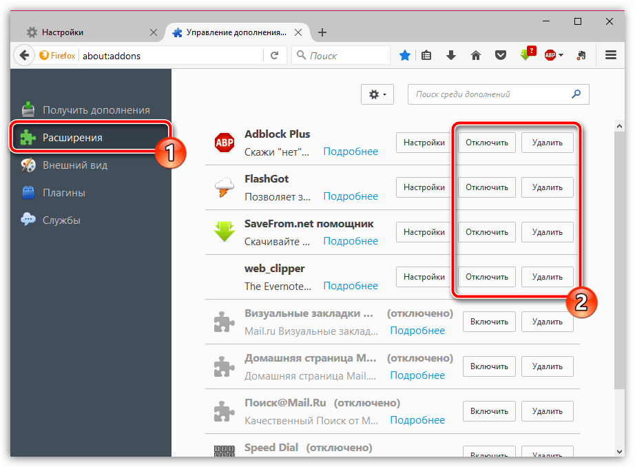 Некоторые дополнения, в особенности те, которые направлены на изменение вашего реального IP-адреса, могут приводить к тому, что Mozilla Firefox не будет грузить страницы. В данном случае единственное решение – отключение или удаление дополнений, которые стали причиной данной проблемы.