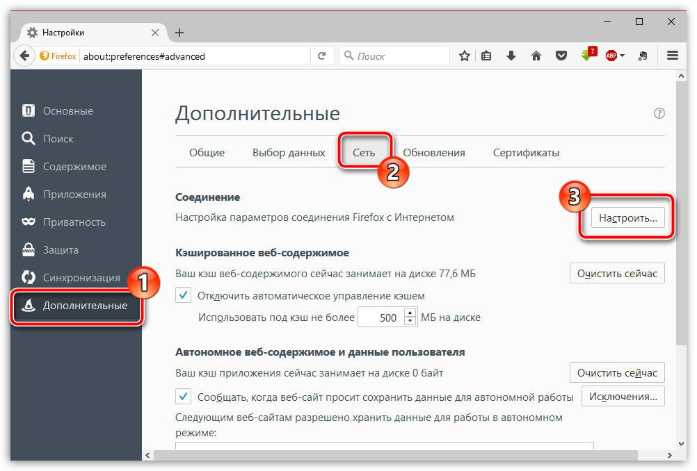 В левой области окна пройдите ко вкладке «Дополнительные» и в подвкладке «Сеть» в блоке «Соединение» щелкните по кнопке «Настроить».