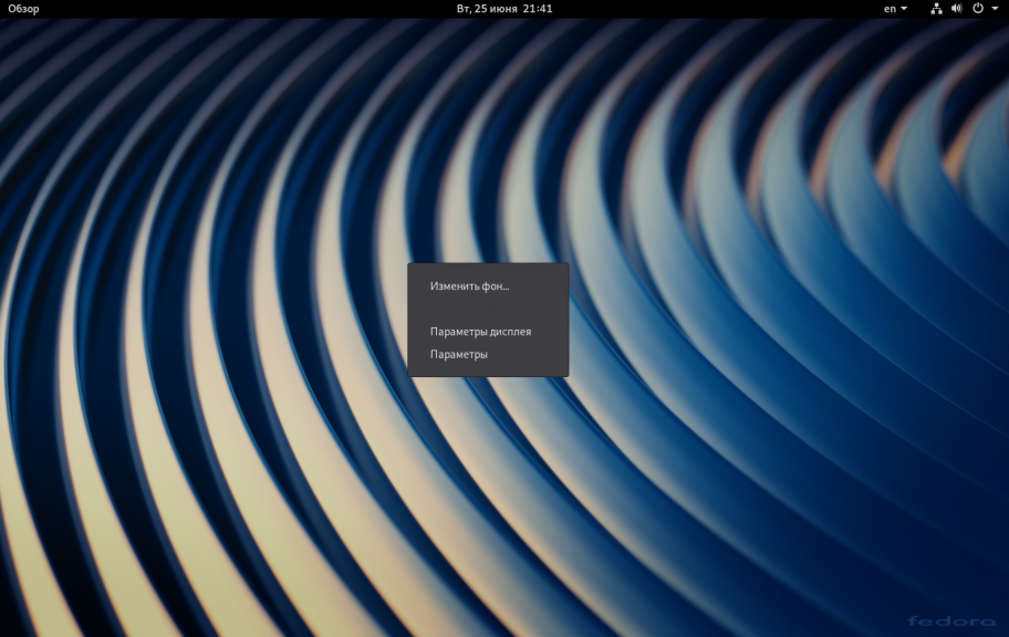 Если вам не нравится фон рабочего стола, используемый в Fedora по умолчанию, вы можете его изменить кликнув правой кнопкой мышки по свободному месту на рабочем столе. Затем, в открывшемся окне выберите Фон: