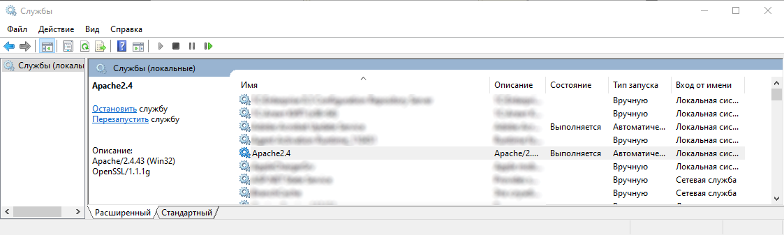 Чтобы изменения вступили в силу, перезапускаем службу Apache (значок в трее — Apache monitor). Если служба перезапустится — это хороший знак. Если нет (выскочит ошибка) — ищите ошибки в конфигурационных файлах. Особенно внимательно проверьте все пути.
