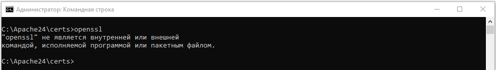 Теперь нужно проверить, что исполняемый файл доступен из переменных окружения операционной системы. Нужно ввести openssl и если будет выведено сообщение, аналогичному на картинке, то воспользуйтесь инструкцией по добавлению директории bin в переменную окружения PATH.