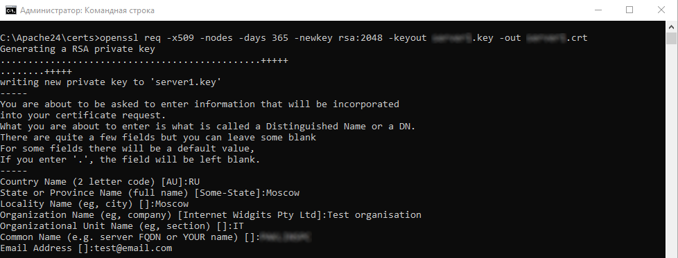 После чего требуется ввести команду генерации сертификата, где вместо <SERVER> нужно подставить имя компьютера, на котором планируется размещен Apache: