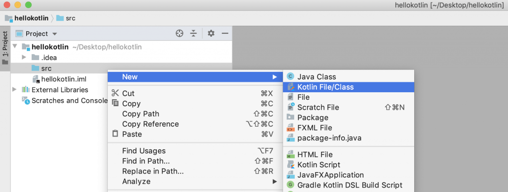 Кликните на стрелку рядом с hellokotlin, чтобы открыть его содержимое, и вы увидите папку src для проекта. Щелкните правой кнопкой мыши на папку src и выберите New ▸ Kotlin File/Class.