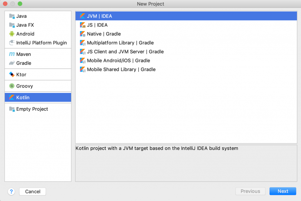 Выберите Kotlin из списка опций слева, Kotlin JVM в качестве типа проекта и нажмите Next.