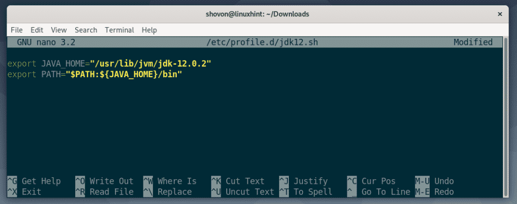 export JAVA_HOME=»/usr/lib/jvm/jdk-12.0.2″export PATH=»$PATH:${JAVA_HOME}/bin»