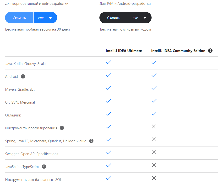 Intellij IDEA доступна в бесплатной (Community) и платной (Ultimate) версиях. Чем они различаются, видно на скрине ниже: