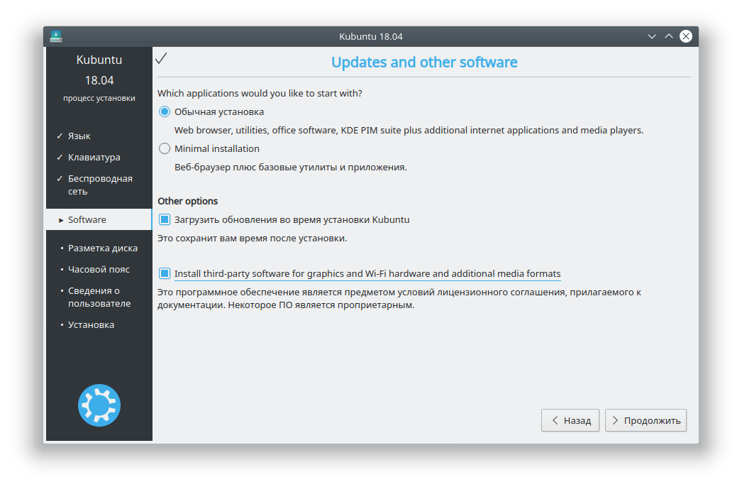 На этом же шаге предлагается скачать обновления во время установки Kubuntu, а также выполнить установку дополнительно проприетарного программного обеспечения (драйвера, кодеки и др.).
