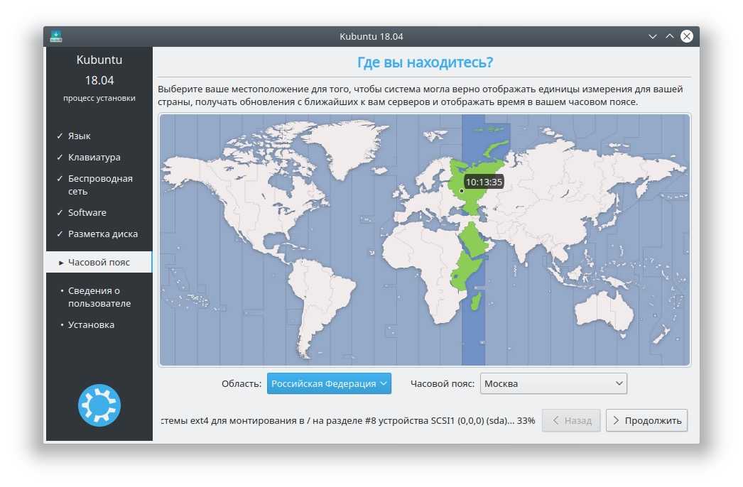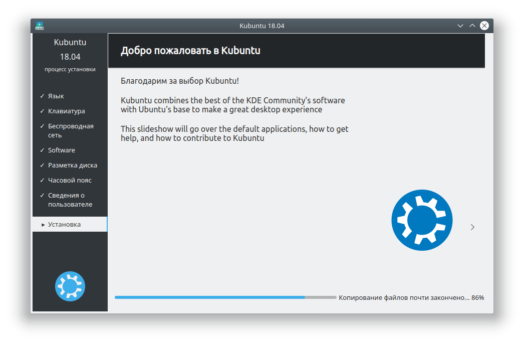 Извлеките установочный носитель и перезагрузите компьютер. Если установка прошла успешно, то вы должны будете загрузиться в свежеустановленную систему Kubuntu.